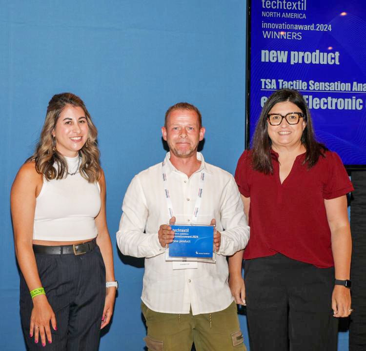 Global Business Development Manager Alexander Grüner nahm bei der Techtextil North America den prestigeträchtigen Innovation Award 2024 in der Kategorie „Neues Produkt“ für das TSA Tactile Sensation Analyzer und die cloud-basierte Virtual Haptic Library entgegen. „Durch das TSA wird eine wissenschaftlich fundierte und reproduzierbare Bewertung der haptischen Eigenschaften von Stoffen ermöglicht und damit die Subjektivität menschlicher Wahrnehmung eliminiert“, erklärt Grüner. „So können Hersteller eine gleichbleibende Qualität sicherstellen, Materialentscheidungen optimieren und die Kundenzufriedenheit steigern.“ Dieser Erfolg unterstreicht nicht nur emtec‘s Innovationsgeist, sondern festigt auch die Firmenvision für die Zukunft: objektive, reproduzierbare Qualitätsmessung – made in Leipzig.